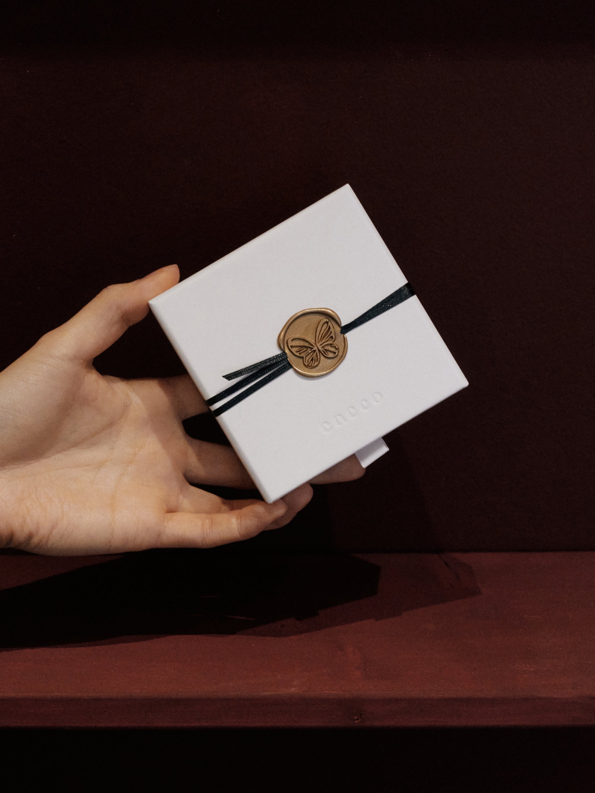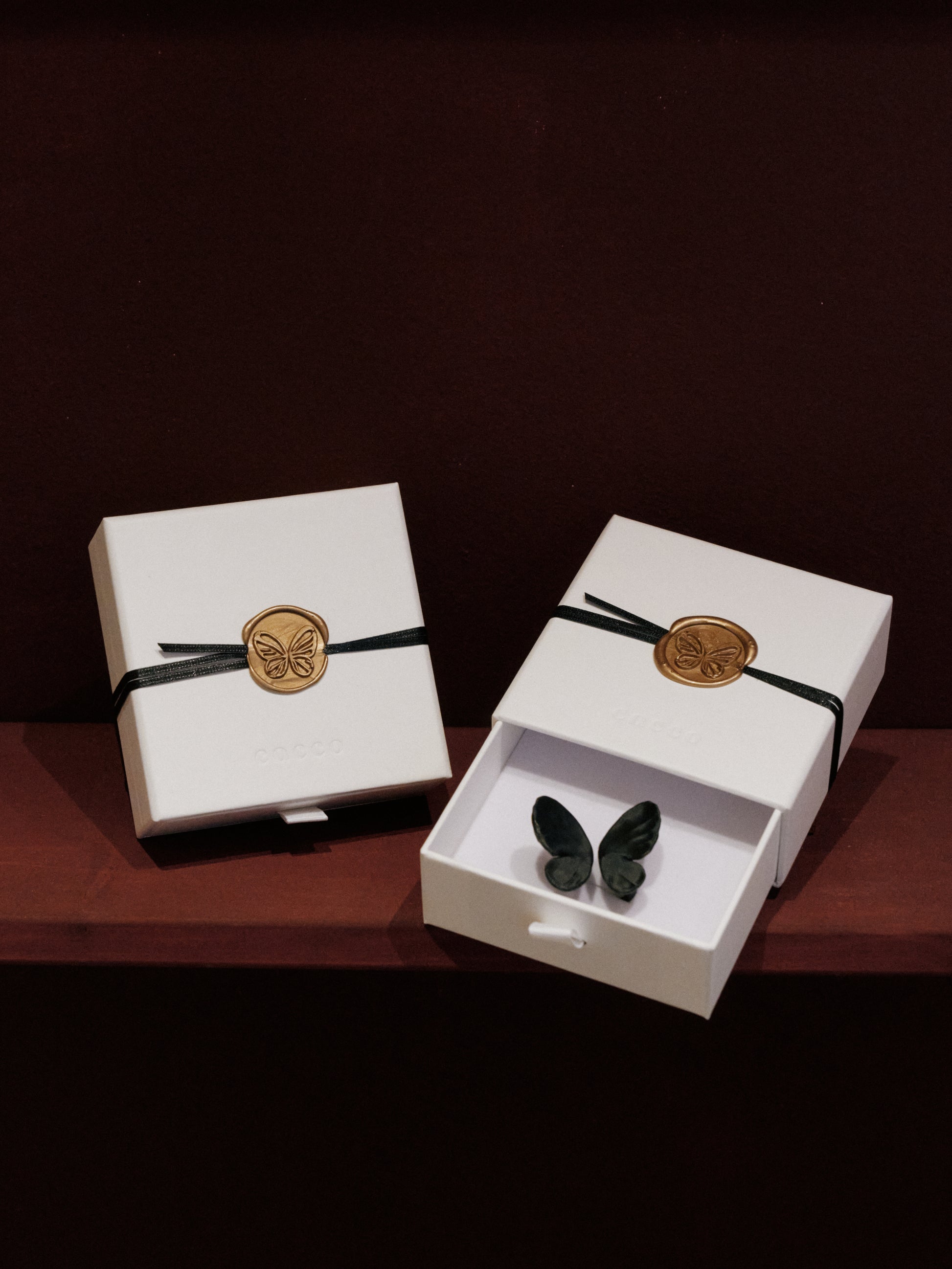 Finished in Berlin with a hand-tied narrow ribbon and a wax seal featuring cacco’s butterfly — a symbol of freedom and transformation.